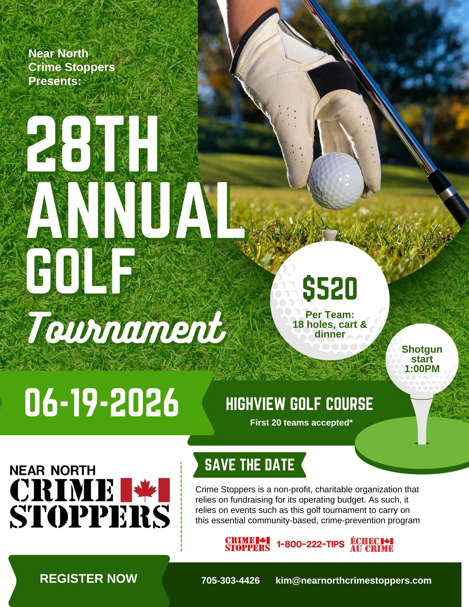 Join us for a day of golf, fun, and community support at the 28th Annual Near North Crime Stoppers Golf Tournament! This exciting event takes place on Friday June 19, 2026, at Highview Golf Course in Powassan, ON.
